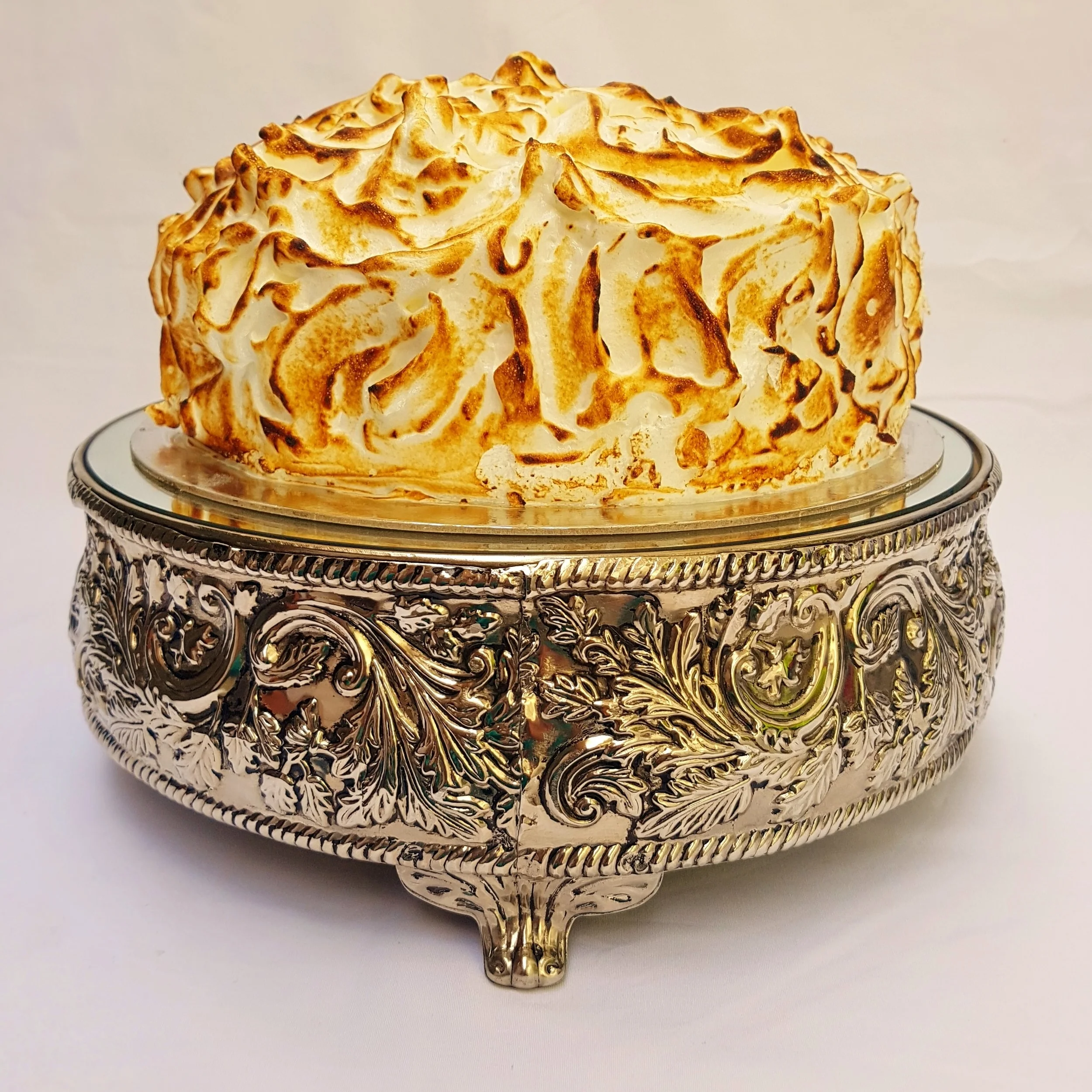 Generous layers of Creme Legere (Bourbon Vanilla pastry cream lightened with Bourbon Vanilla whipped Cream) in between layers and layers of sponge cake and indulgently frosted with (reduced sugar) Lemon Swiss Meringue.